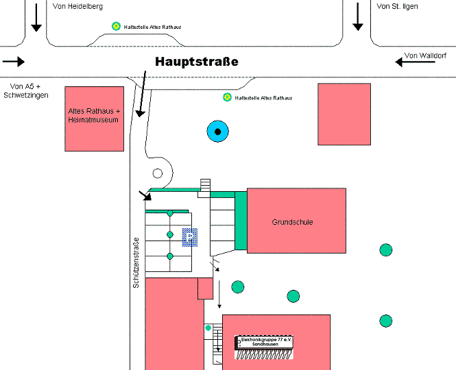Fahren Sie in Richtung Sandhausen. Benutzen Sie die zweite Einfahrt nach Sandhausen. Hier kommen Sie an einer Aral-Tankstelle vorbei. Folgen Sie dieser Straße an der Volksbank vorbei (zu Ihrer rechten) und folgen Sie dann der Vorfahrtsstraße indem Sie links abbiegen. Am Anfang der Bushaltestelle (rechts) biegen Sie links in die Schützenstraße ein. Ab hier gilt die Beschreibung "Sandhausen intern"